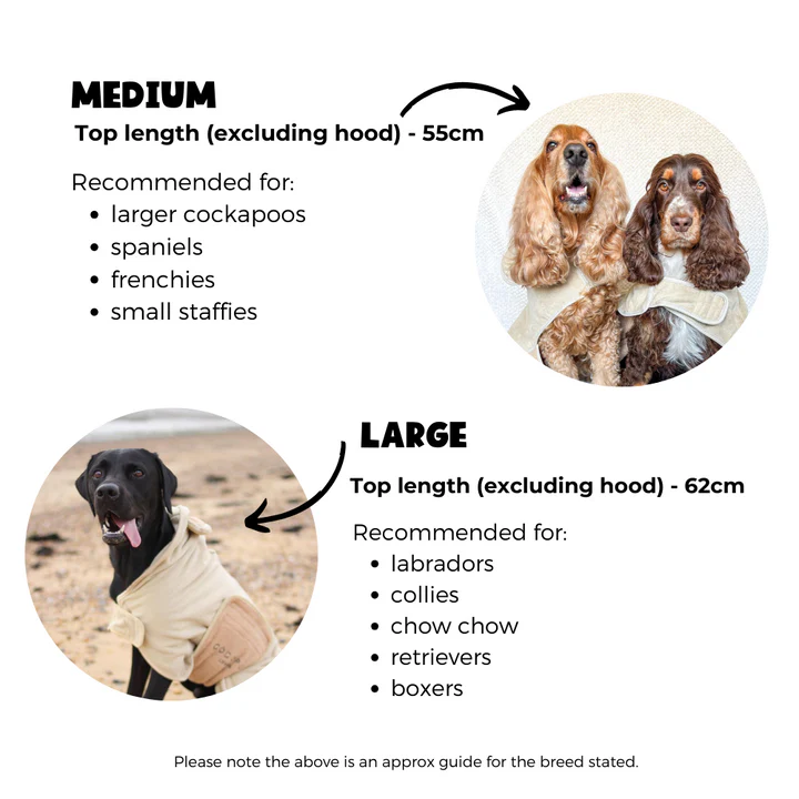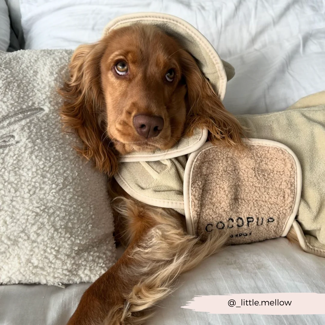 Stop je hond in onze badjas en maak hem vast rond de buik en nek met onze super eenvoudige klittenband. Ideaal om in te relaxen na een wandeling… zeg maar dag tegen natte hondengeur en eindeloos wrijven!
