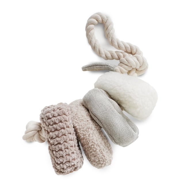 - 1 x TAUPE kauwblok in corduroy met zakken om lekkernijen vast te houden.